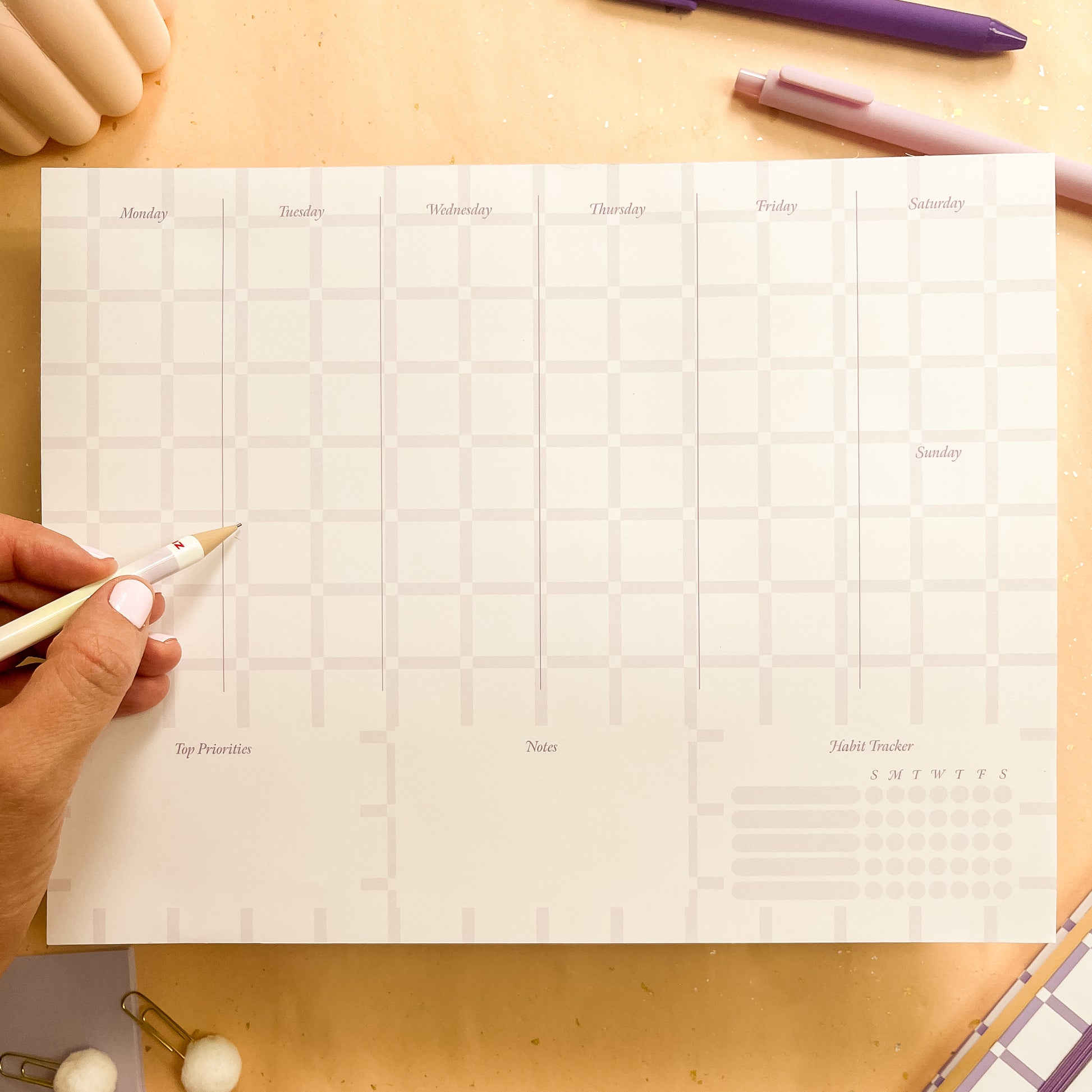 Organize your week with elegance and ease. The Orchid Grid weekly desk planner features a soft lavender grid design that adds a calm, refined touch to any workspace. With a clear Monday-start layout, built-in habit tracker, and space for top priorities and notes, it’s designed to support both focus and flow.