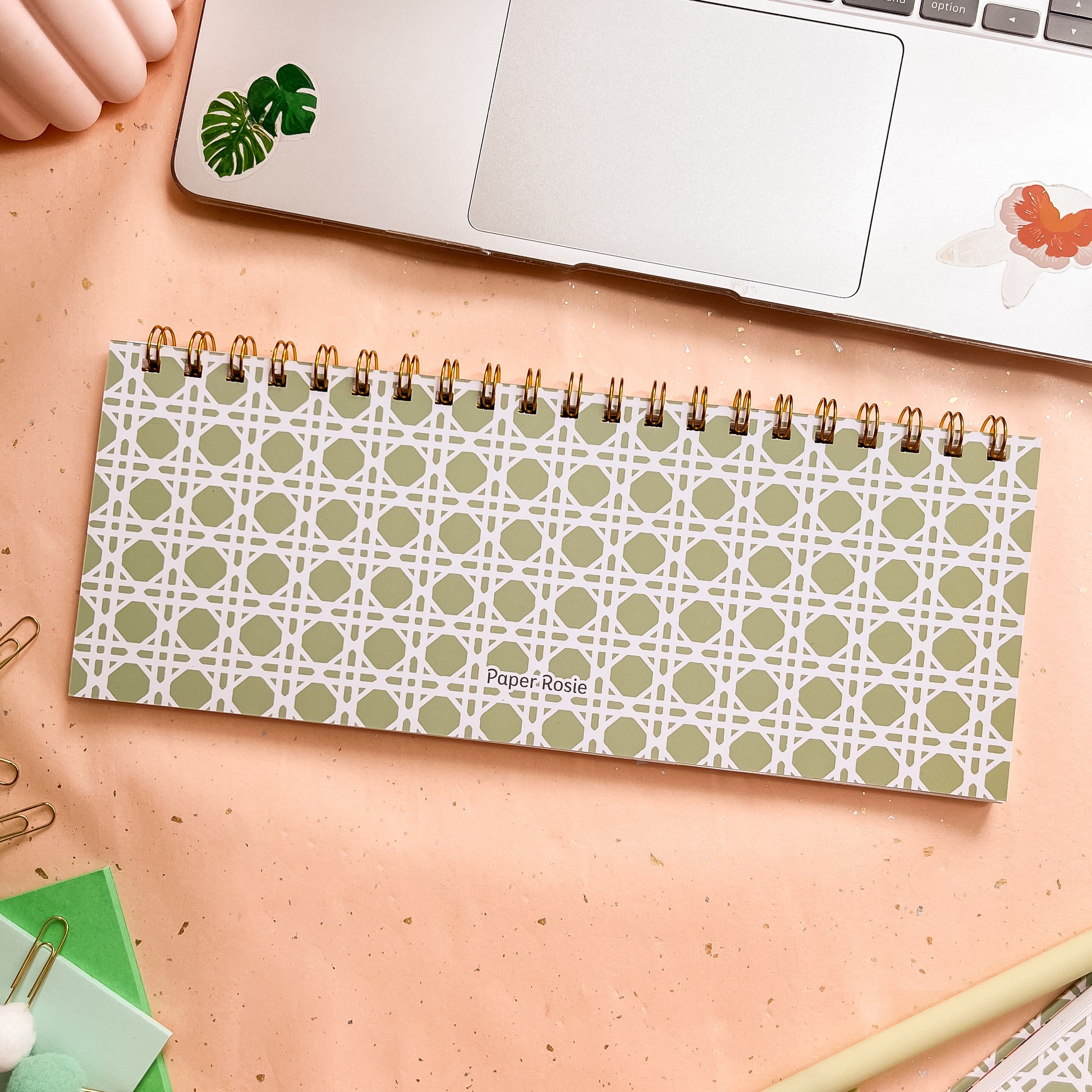 Root your week in calm structure with the Sage Trellis keyboard planner. Featuring a soft green geometric cover inspired by garden trellises, this slim and flexible desk companion brings order and lightness to your daily routine. With space to plan each day, track habits, list priorities, and jot down notes, it helps you stay focused while maintaining a peaceful vibe.