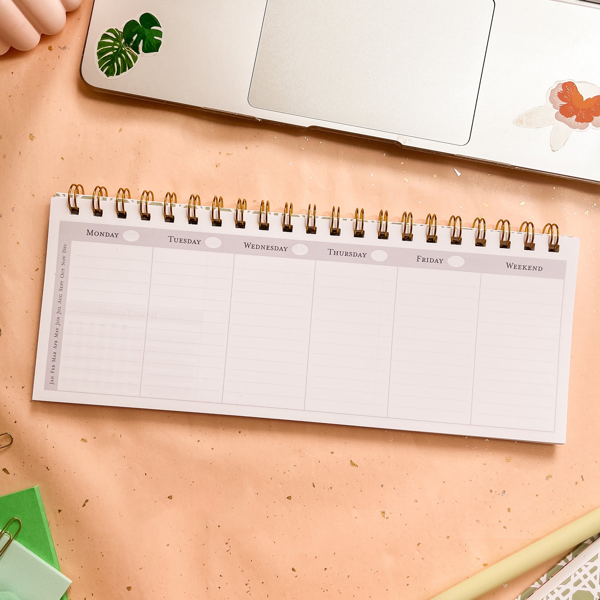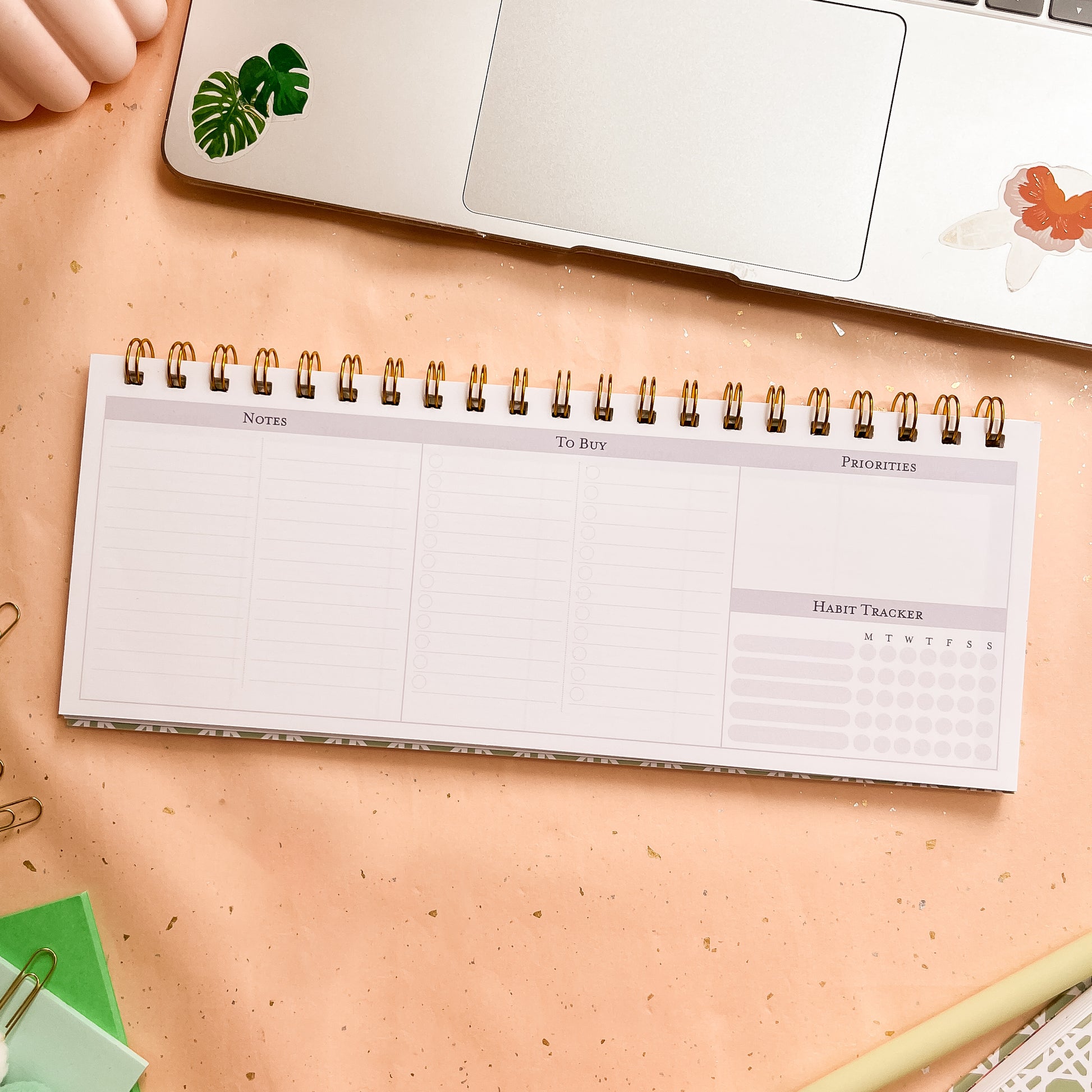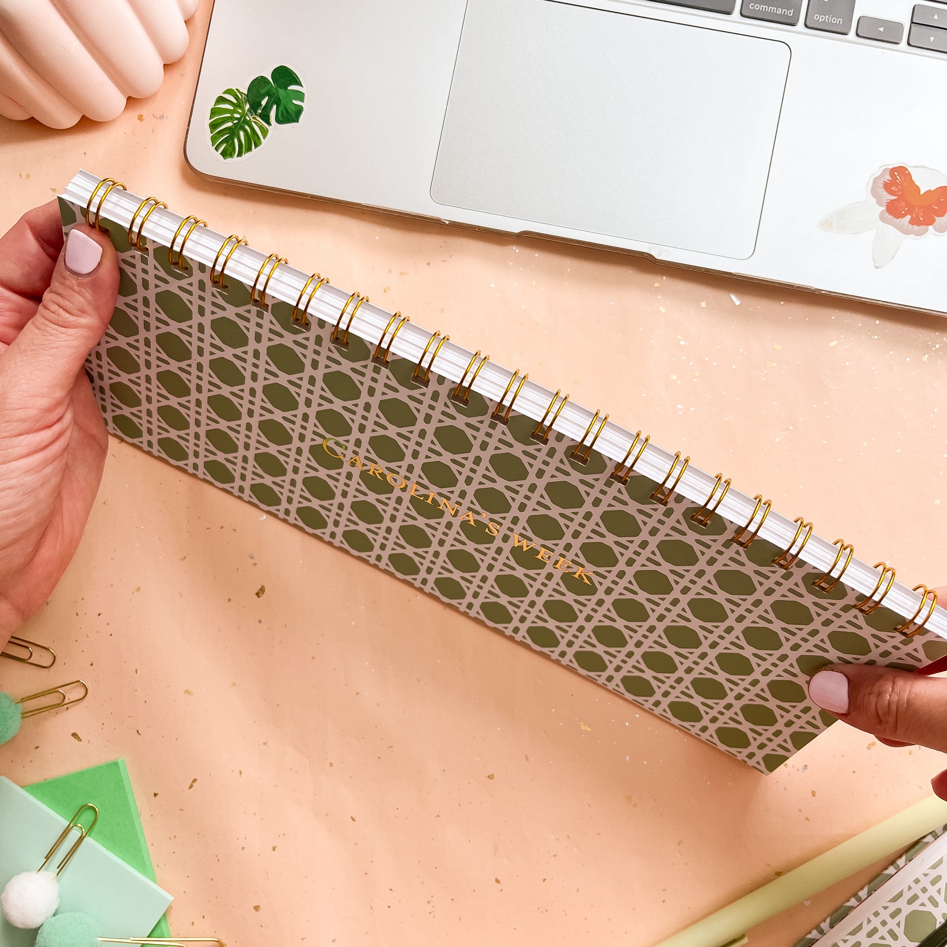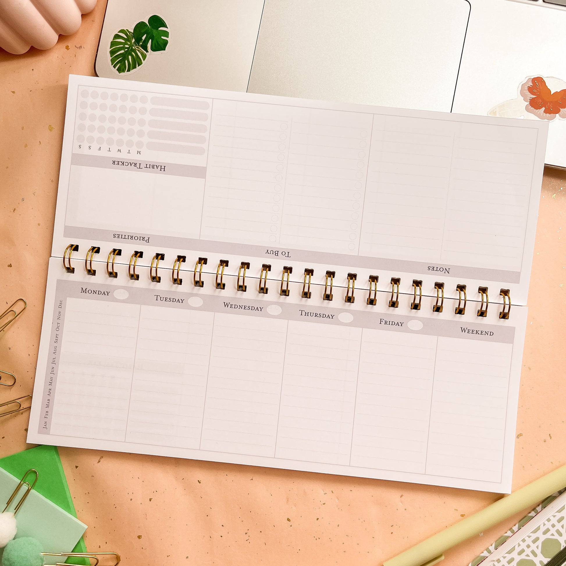 Made with a soft-touch velvet finish and sturdy golden wire-o binding, each double-sided page is built to last. Whether you’re working from home, managing a family schedule, or starting fresh in your self-care practice, Sage Trellis is your planner for balance and bloom.